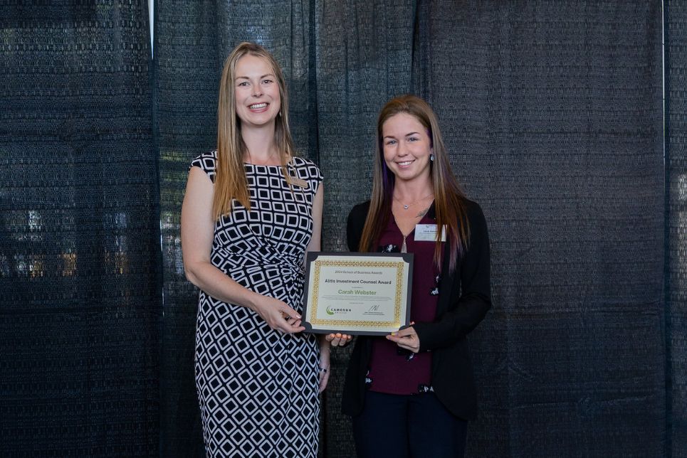 Emily Hofmann presenting Carah Webster with an Alitis Investment Counsel Award at last year’s awards ceremony.