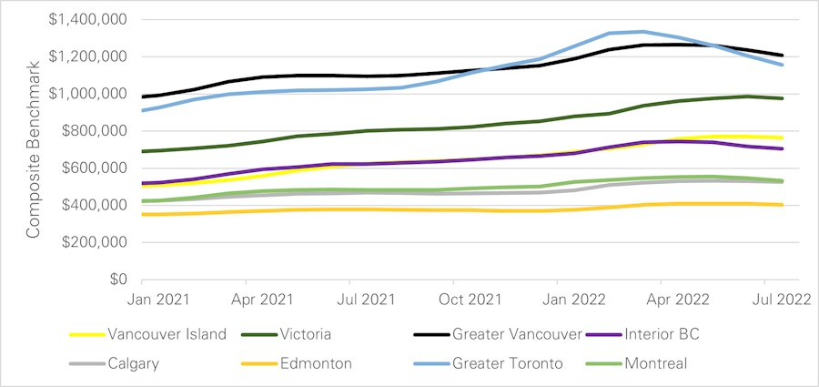 When looking closer at specific markets, such as Toronto, though its HPI is down roughly 20% over the past four months, the average home sold price is still up 1% year over year. The HPI Benchmark Price for the Greater Toronto Area (GTA) was $1,157,500 for July 2022, down 4% month-over-month from $1,204,900 in June 2022. This is the fourth month in a row that the GTA’s benchmark home price has decreased month-over-month. Prior to April 2022, the benchmark price had risen for 19 consecutive months, starting from August 2020 until the peak in GTA’s benchmark home price in March 2022.